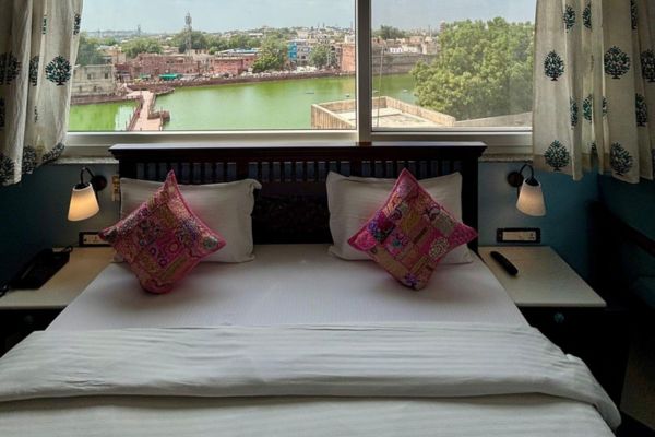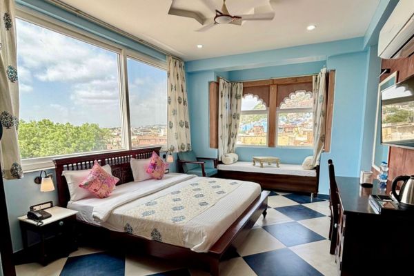 The Fort and Lake View Superior Room with Jharokha, located on the 3rd floor, offers enchanting views of the majestic Mehrangarh Fort along with the serene beauty of the lake. Elegantly designed for comfort, the room features a spacious double bed and a traditional Jharokha Sit Out for a truly royal experience. Modern amenities include complimentary Wi-Fi, LED television, telephone and intercom, mineral water, tea/coffee maker, and a room heater (on request). An attached bathroom with contemporary fittings and hot/cold water, along with a wardrobe and 24-hour room service, ensures a luxurious and memorable stay.