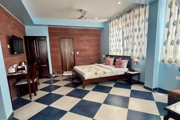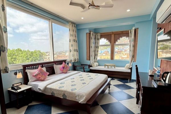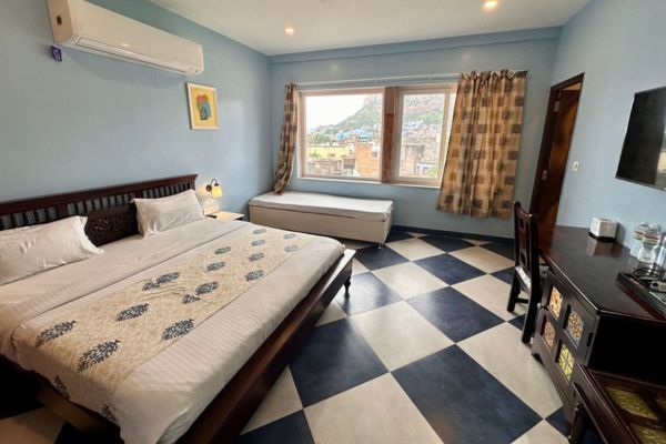 The Fort View Deluxe Room, located on the 2nd floor, offers a pleasant city view along with a partial glimpse of the majestic Mehrangarh Fort. Designed for comfort, the room features a double bed and modern amenities including complimentary Wi-Fi, LED television, telephone and intercom, mineral water, tea/coffee maker, and a room heater (on request). An attached bathroom with contemporary fittings and hot/cold water, along with a wardrobe and 24-hour room service, ensures a relaxed and enjoyable stay.